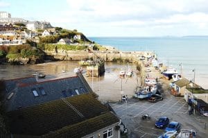 Newquay Harbour is a working fishing harbour protected by two walls. Towan beach is situated on the east of the harbour. The harbour dries out at low tide.