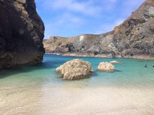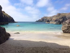 Kynance Cove is a stunning cove with dramatic rock formations, caves and cliffs. At low tide there is a lovely sandy beach and this coupled with it’s sheltered rocks makes it a great place for swimming.
