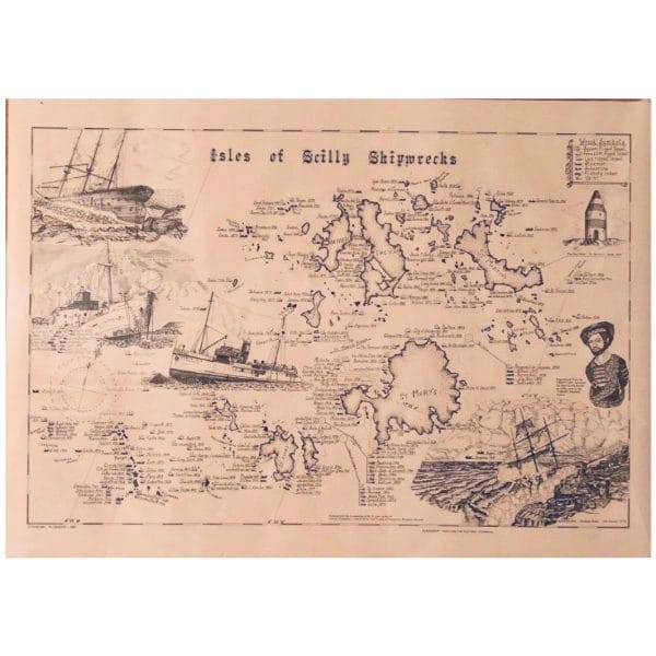 This poster / print shows the position, dates and types of shipwrecks around the Isles of Scilly