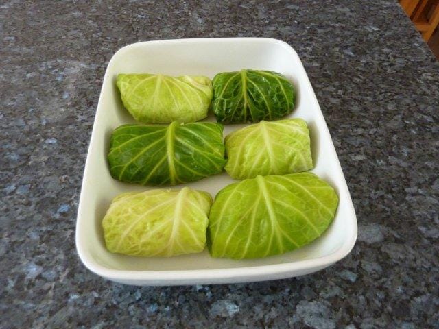 8) Turn in the sides of the cabbage leaf and then roll up and place into a greased oven proof dish with the seam underneath