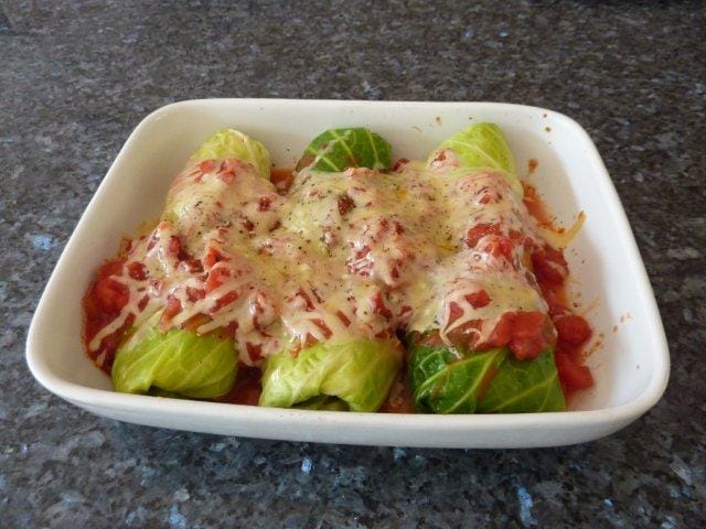 10) Poor a tin of chopped tomatoes over the cabbbage rolls and then add a good handful of grated cheese and some seasoning